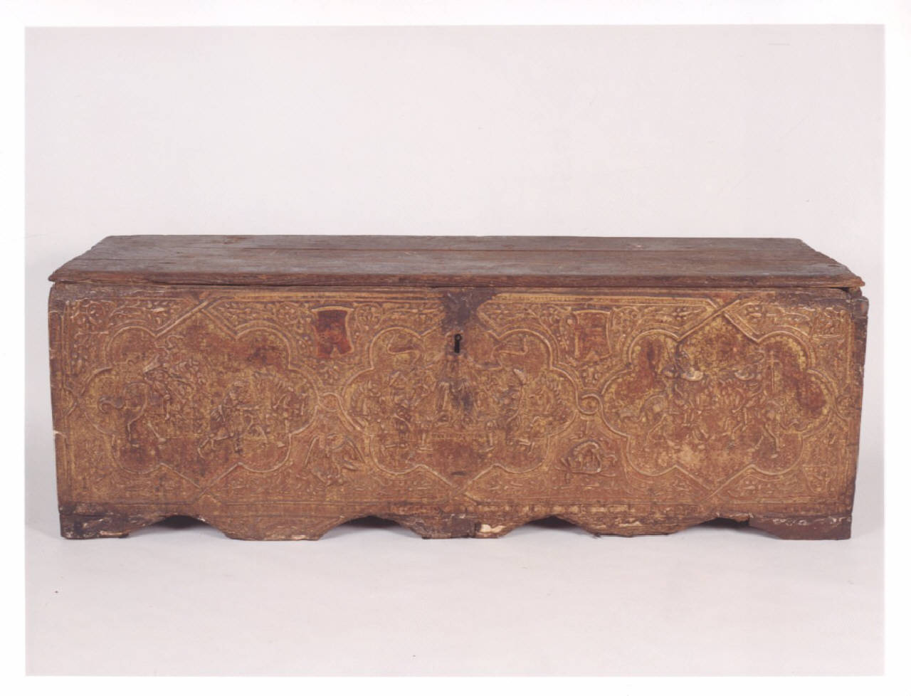 Cassone in pastiglia dorata con semplici appoggi ondulati; coperchio a rialzo; fronte con tre medaglioni polilobati che racchiudono scene cavalleresche mentre nella parte superiore compaiono due stemmi senza insegne araldiche perchè abrase.