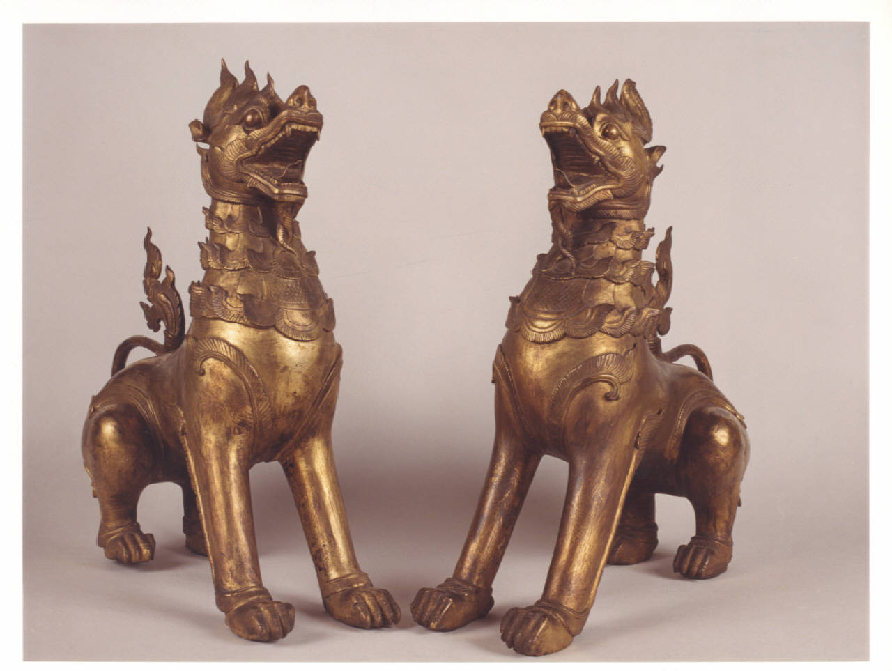 Dragone in bronzo dorato, seduto sulle quattro zampe, coda ritta, fauci spalancate.