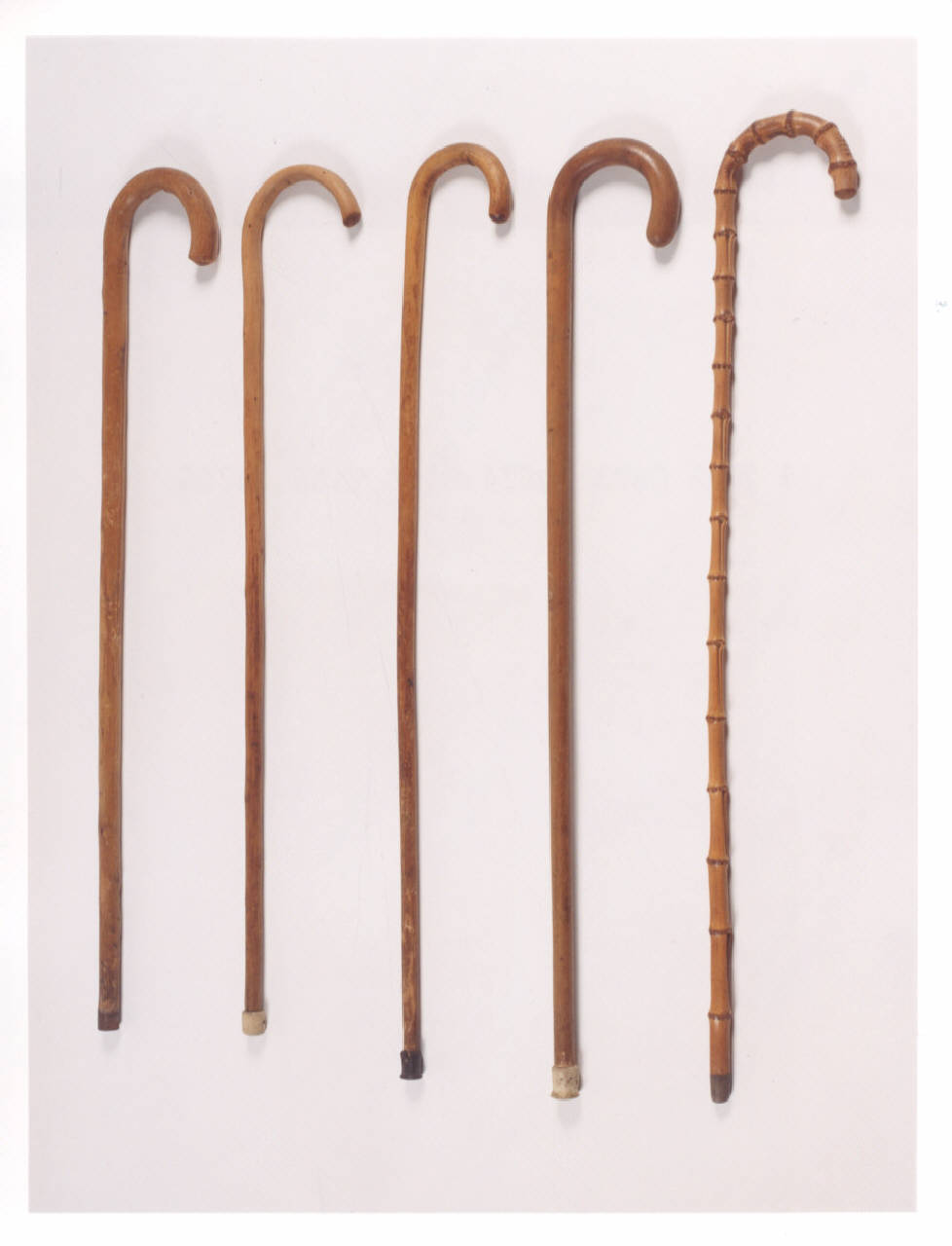 Quattro bastoni in bambù senza manico con punta in metallo per la montagna; due bastoni in bambù con manico ricurvo da passeggio; quattro bastoni in legno con manico ricurvo da passeggio e uno con impugnatura in osso.