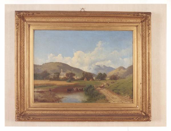 - NOTIZIE STORICO CRITICHE L'opera, già nella collezione delle sorelle Gigina e Nedda Necchi, entra a far parte del patrimonio FAI nel 2001, in quanto parte del lascito di Villa Necchi Campiglio a Milano. Il dipinto rappresenta una veduta su una campagna, appena al di fuori del villaggio abitato, dove vengono fatti pascolare gli armenti. Al momento dell'ingresso in Villa, il dipinto risulta attribuito a Gaetano Fasanotti, pittore lombardo e allievo del bresciano Giovanni Renica grazie al quale è introdotto alla pittura di paesaggio, dopo un breve iniziale periodo di dipinti con soggetti storici (es. "Discesa di Berengario in Italia" conservata presso l'Accademia Carrara di Bergamo). Insegnò all'Accademia di Brera come titolare della cattedra di paesaggio, svolgendo una didattica assai inconsueta per allora, in quanto conduceva gli allievi all'aperto perchè copiassero il vero, favorendo l'inflessione veristica. Fu autore di suggestive vedute milanesi e di piacevoli paesaggi, come illustra l'opera in oggetto, probabilmente realizzata "en plein air".