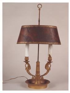 Portacandela in bronzo dorato costituito da una vaschetta tonda con colonna centrale e due luci a forma di cigno; paralume in cuoio con impressioni dorate; adattato a elettricità.