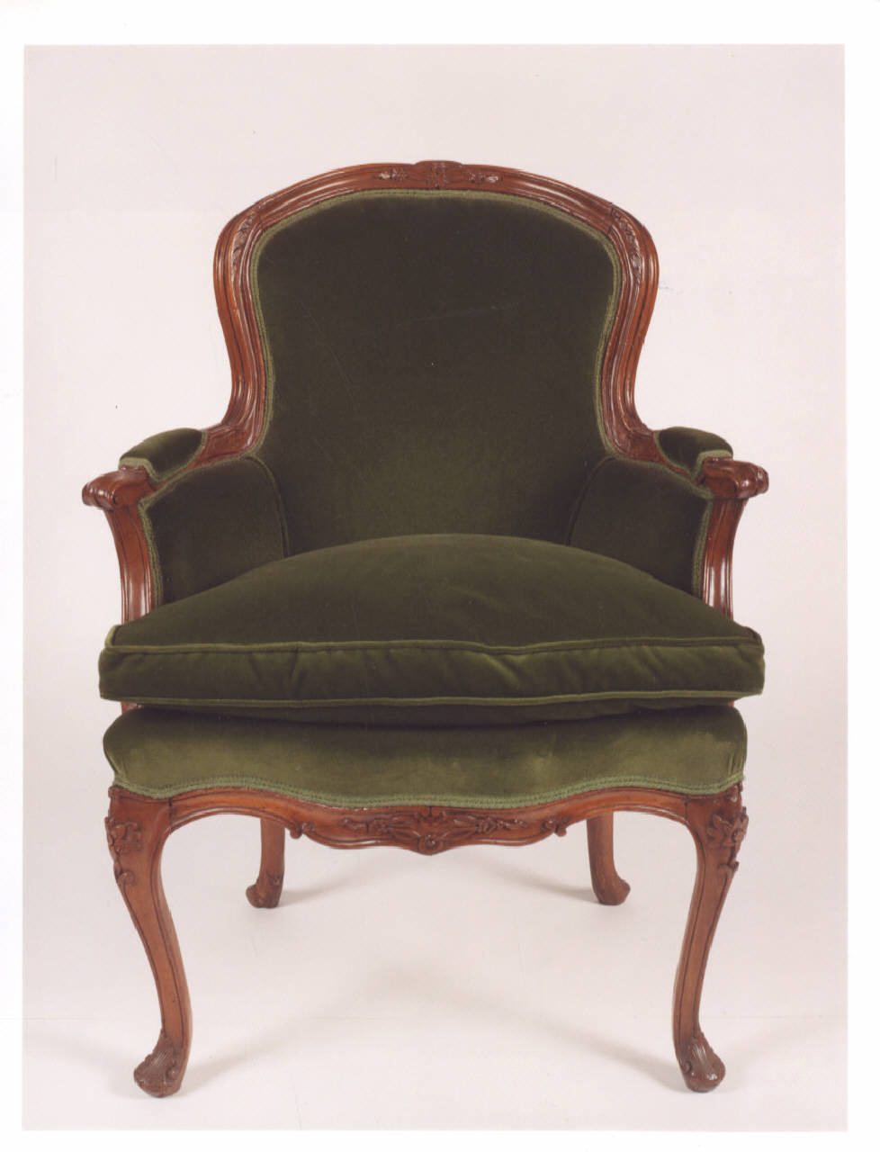 Poltrona in noce; bordo dello schienale scolpito con foglie d'acanto e fiori, rivestito in velluto verde come la seduta.