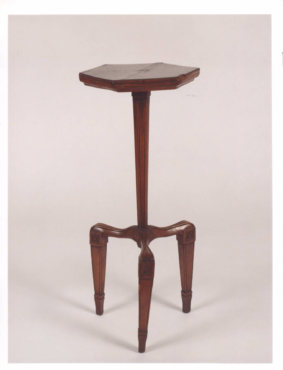 Tavolino Luigi XVI prodotto in Veneto; caratterizzato da un piano esagonale, fusto centrale rastremato verso il basso con scanalatura, tre piedini alti scanalati e con motivo decorativo floreale.
