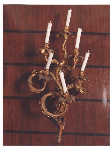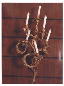 - NOTIZIE STORICO CRITICHE Lo stile Luigi XV trae il nome dal Re di Francia, sviluppandosi alcuni anni dopo la sua ascesa al trono (1722) e corrispondente al massimo sviluppo del rococò. L'applique in esame ben evidenzia questa tipologia, con i sei bracci dall'andamento fortemente mosso e sinuoso.