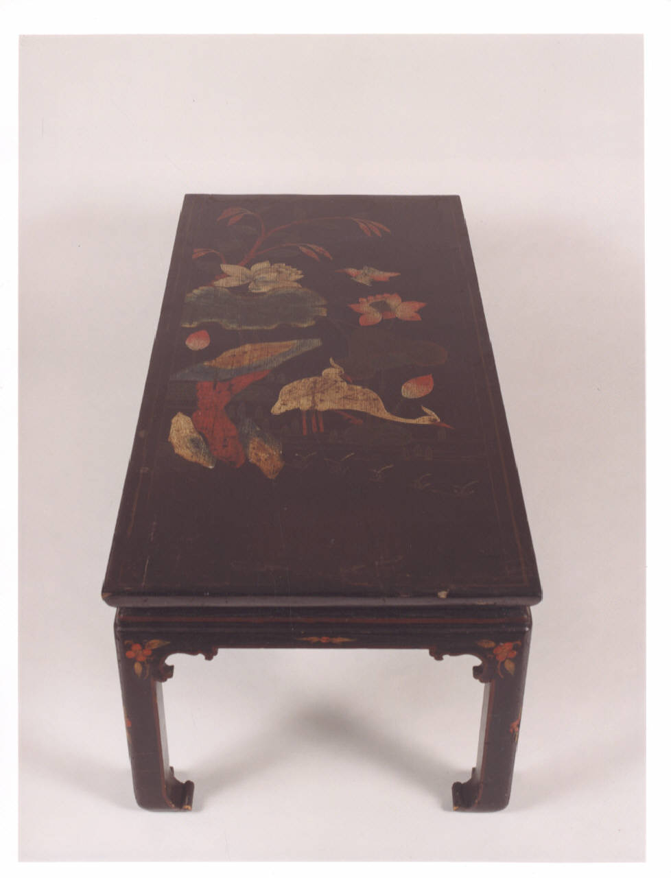 Tavolino da salotto con decorazione giapponesizzante formata da gru, fiore di loto, un uccellino e bambù.