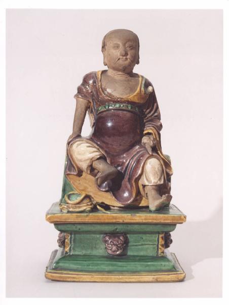 Piccola scultura raffigurante una divinità. Appoggiata sul basamento vi è una tartaruga; nelle parti laterali decoro con piccole faccine di animali.