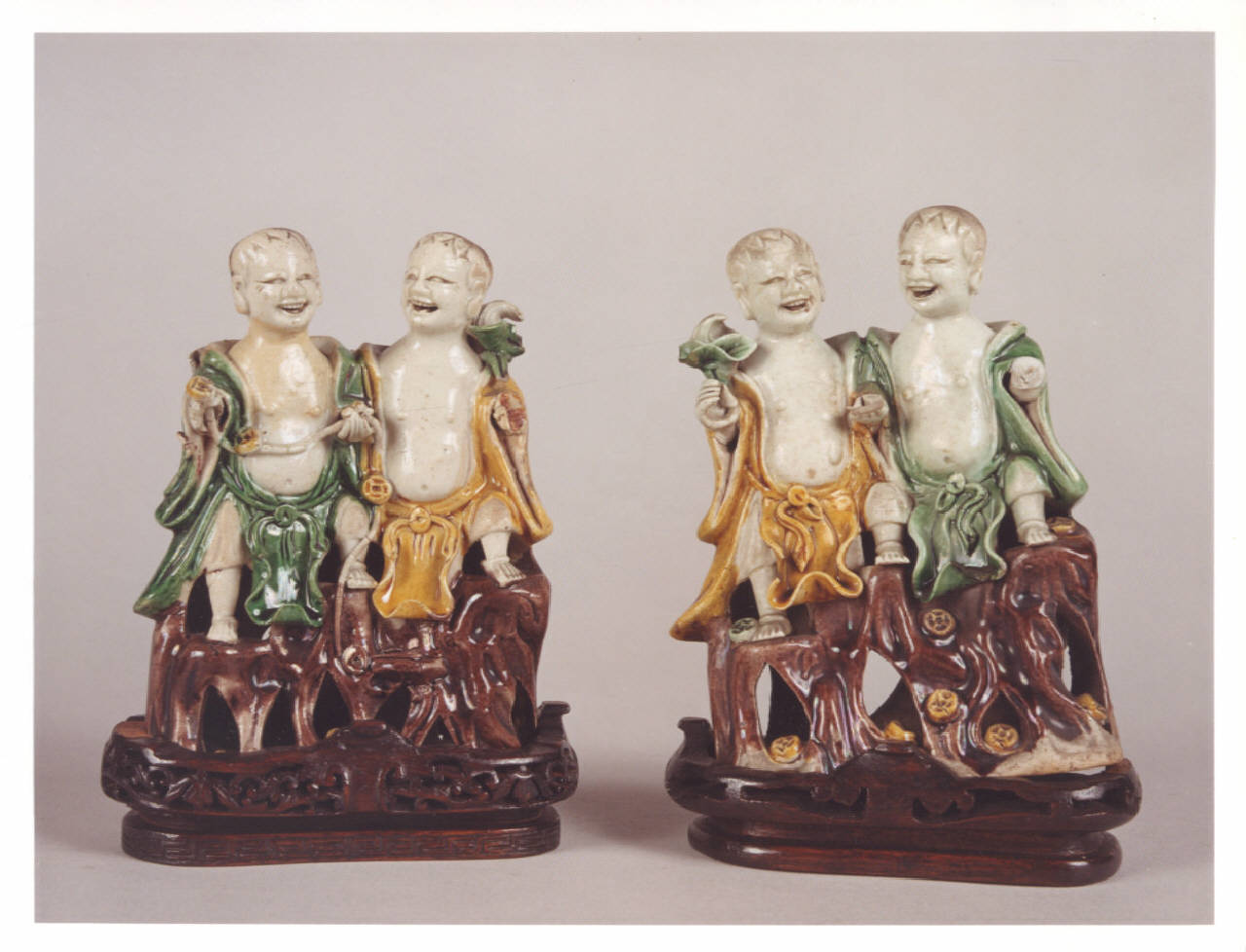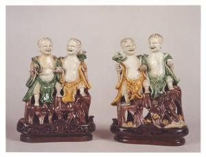 Coppia di sculture di piccole dimensioni con raffigurazione di quattro attori del teatro comico, come suggeriscono i visi ilari e sorridenti e gli oggetti che trattengono nelle mani.