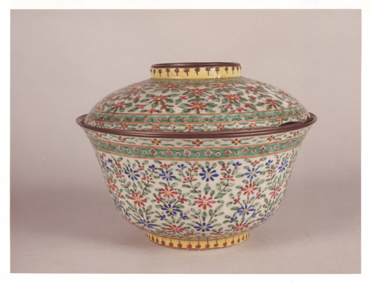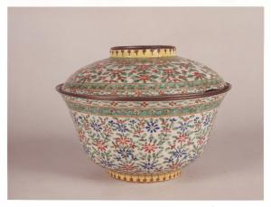 - NOTIZIE STORICO CRITICHE Questa piccola ciotola, realizzata a Canton, è un pezzo probabilmente creato per l'esportazione in Europa come farebbe supporre il delicato decoro floreale nei colori rosso e blu con foglie verdi simmetricamente composto sia sulla ciotola che sul coperchio.