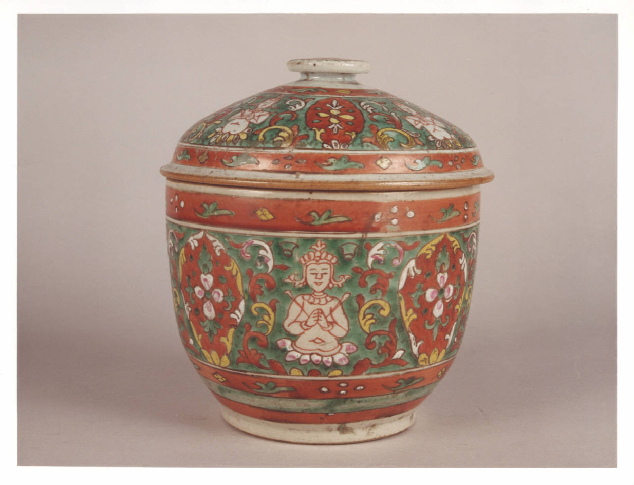 Vaso con coperchio: decorazione con divinità definite mediante una linea rossa e stagliate su fondo verde con decoro a racemi floreli.
