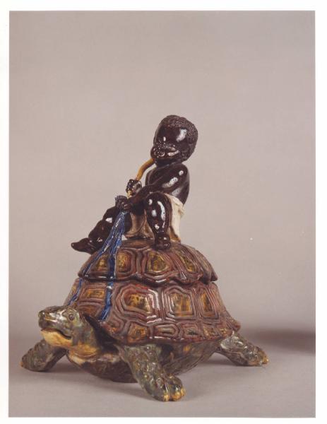 Scatola a forma di tartaruga in ceramica dipinta e smaltata sormontata da un moretto che la trattiene per le briglie.