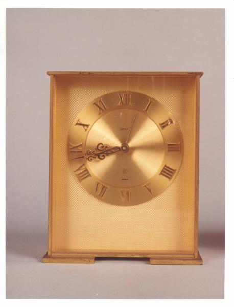 Orologio da tavolo svizzero (manifattura Jaeger) in metallo dorato con quadrante rotondo e ore segnate in numeri romani; fondo della cassa a nido d'ape.
