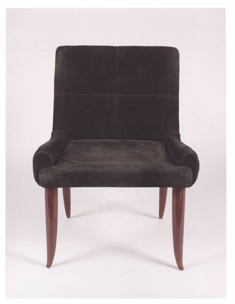 Dodici sedie in legno di mogano rivestite in pelle scamosciata; prive di braccioli, gambe cilindriche rastremate verso il basso e leggermente svasate.