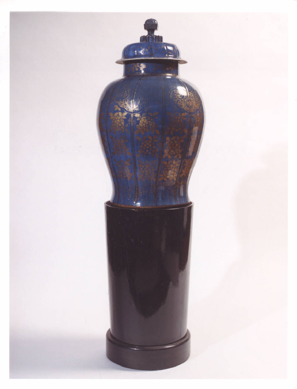 Grande vaso in porcellana smaltata in blu con decoro di crisantemi in oro; coperchio con finale in legno. Base in legno.