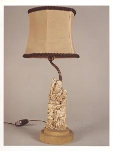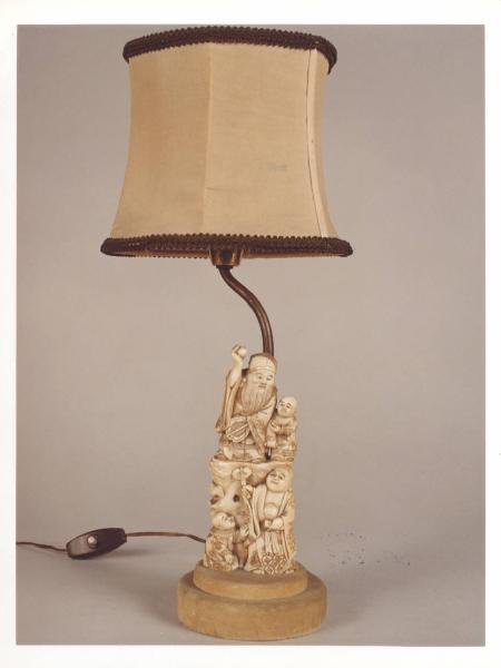 Gruppo scultoreo in avorio raffigurante un saggio con tre discepoli, montato a lampada in epoca moderna; paralume in seta con passamaneria e base circolare in velluto beige.\nQuesta interessante scultura, di manifattura cinese, presenta un gruppo di quattro figure disposte su due livelli sovrapposti e divisi tra loro dalla base del piccolo promontorio su cui poggia il saggio anziano e un discepolo. Nella parte sottostante si ha un discepolo più giovane e un altro. Sembra che stiano giocando, come farebbe supporre la pallina in mano all'uomo più anziano e quegli strani oggetti che piaono molto simili a delle racchette. Particolarmente accurato è il decoro delle vesti e l'espressività dei volti.