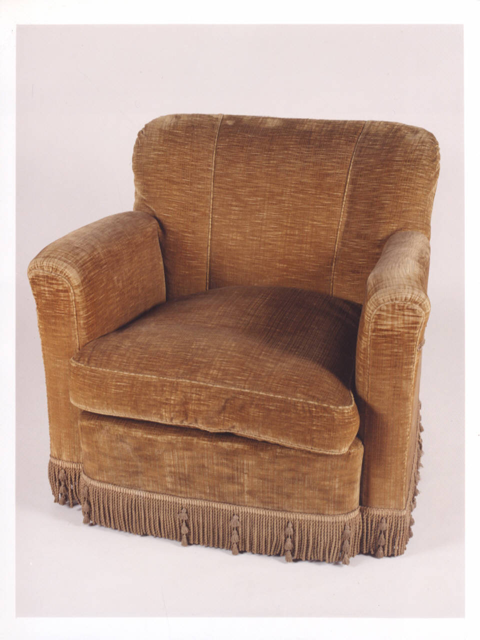 Coppia di poltrone rivestite in velluto di seta millerighe in color senape; passamaneria con frange nella parte finale.