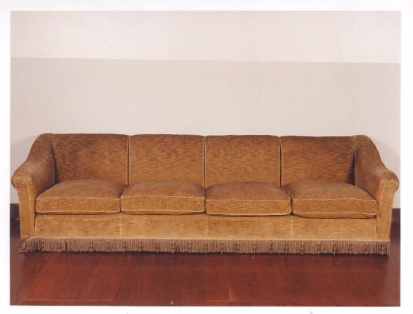 Divano a quattro posti rivestito in velluto di seta millerighe in color senape; passamaneria con frange nella parte finale.
