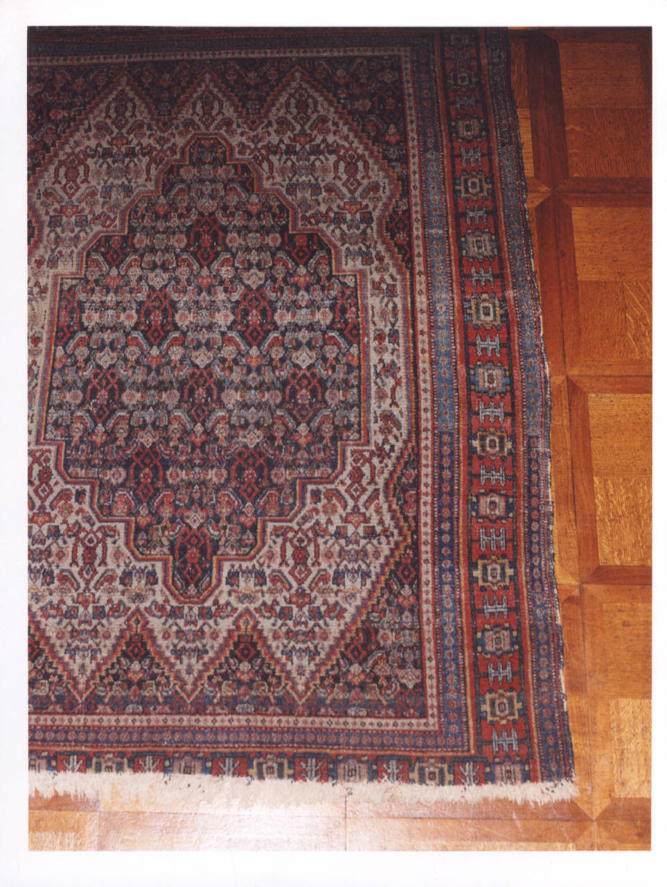 - NOTIZIE STORICO CRITICHE Il tappeto Kashan presenta un medaglione centrale polilobato, mentre le cornici principali hanno motivi differenti. Il particolare cromatismo di questi esemplari si basa sul forte contrasto tra la bordura scura generalmente blu o rossa e il campo, il cui sfondo di solito rosso o avorio è arricchito da fitti motivi che prediligono le tinte pastello come l'azzurro, l'avorio, il rosa, il verde pallido.\nIl tappeto in precedenza si trovava al primo piano, Camera da letto di Nedda Necchi, sotto la scrivania.