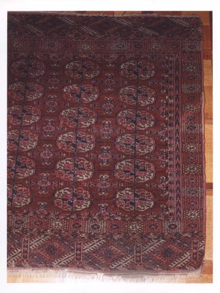 - NOTIZIE STORICO CRITICHE Tappeto di manifattura Teke con il caratteristico decoro a "gul" particolarmente apprezzato in occidente. Infatti il comunissimo termine generico Bukhara si riferisce proprio a questi tappeti. I gul sono collegati fra loro da sottili strisce verticali e orizzontali che li suddividono in quattro parti; presenta un motivo secondario cruciforme denominato "tshemtshe" che significa "cucchiaio". Nella bordura si hanno dei rombi sovrapposti con motivo decorativo centrale.\nIn precedenza il tappeto si trovava al primo piano, Bagno ospiti.