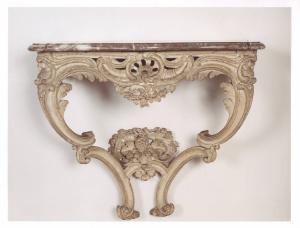 - NOTIZIE STORICO CRITICHE Lo stile Luigi XV deve il suo nome proprio a questo re di Francia, asceso al trono nel 1722. Iniziato a partire dal 1730 rimase in voga sino al 1760, connotandosi come periodo in cui si ebbe il massimo sviluppo del rococò. La console in esame è un degno rappresentante di questo stile, con un motivo centrale a conchiglia da cui pende un festone di fiori, ripreso più ampiamente nel raccordo delle traverse e nella parte superiore dei sostegni, molto sinuosi e alleggeriti da piccole foglie.