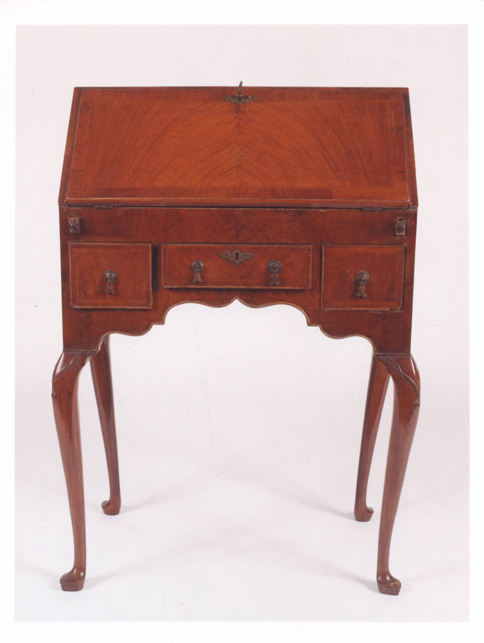 Piccola scrivania in stile inglese con scrittoio a ribalta chiuso da una serratura con chiave; tre cassetti, di cui quello centrale più lungo, sostegni curvilinei. All'interno vi sono cinque cassettini.