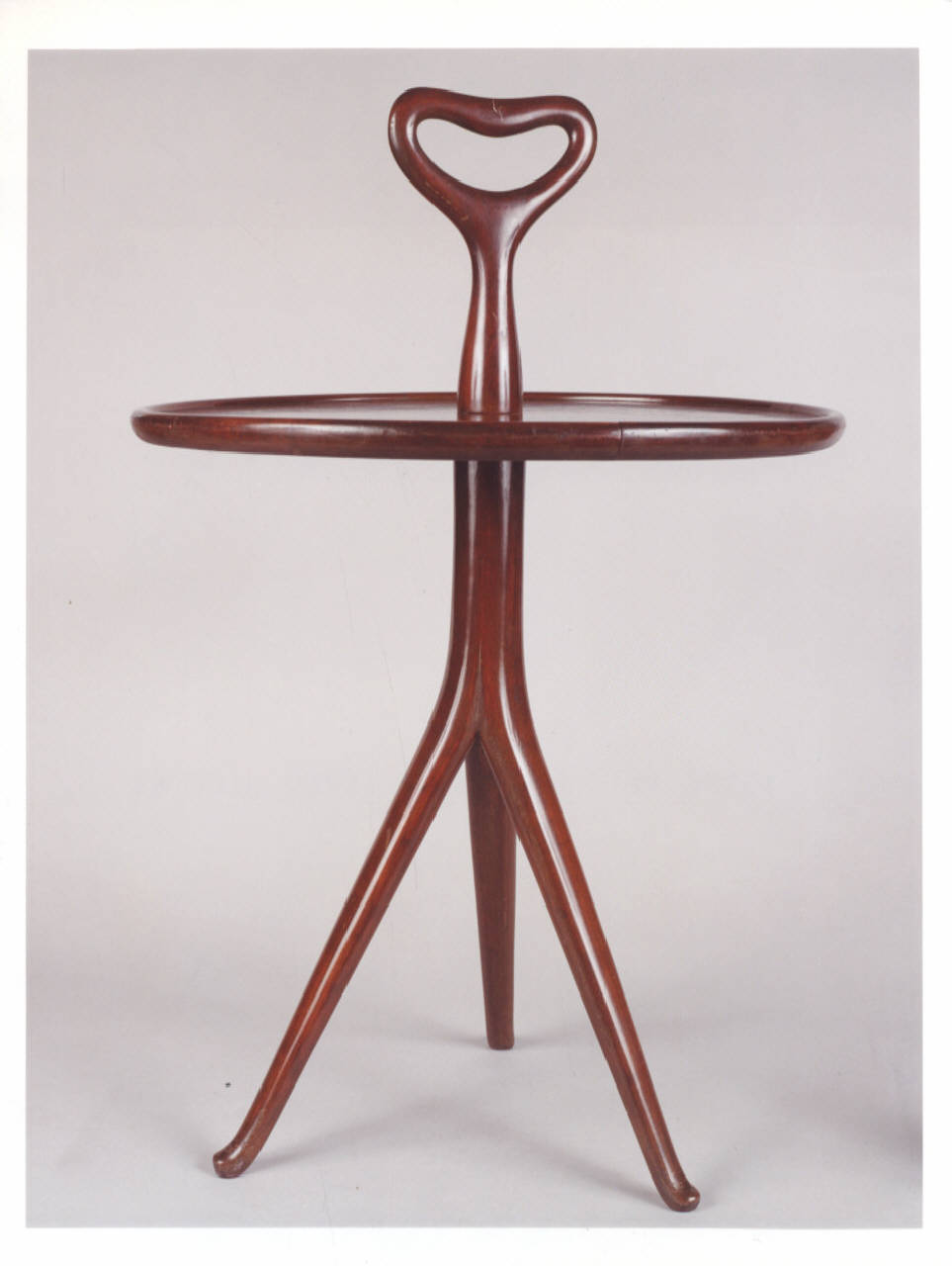 Tavolino da servizio con piano rotondo e base con tre sostegni; impugnatura cuoriforme nella parte superiore.