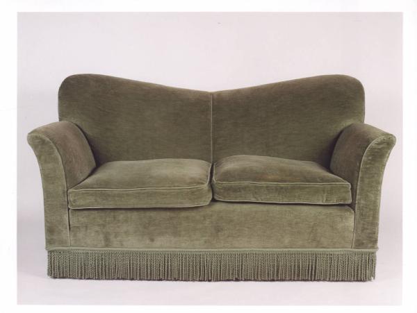 Coppia di divanetti dallo schienale sagomato come i braccioli, leggermente arcuati verso l'esterno; passamaneria con frange nello stesso colore verde.