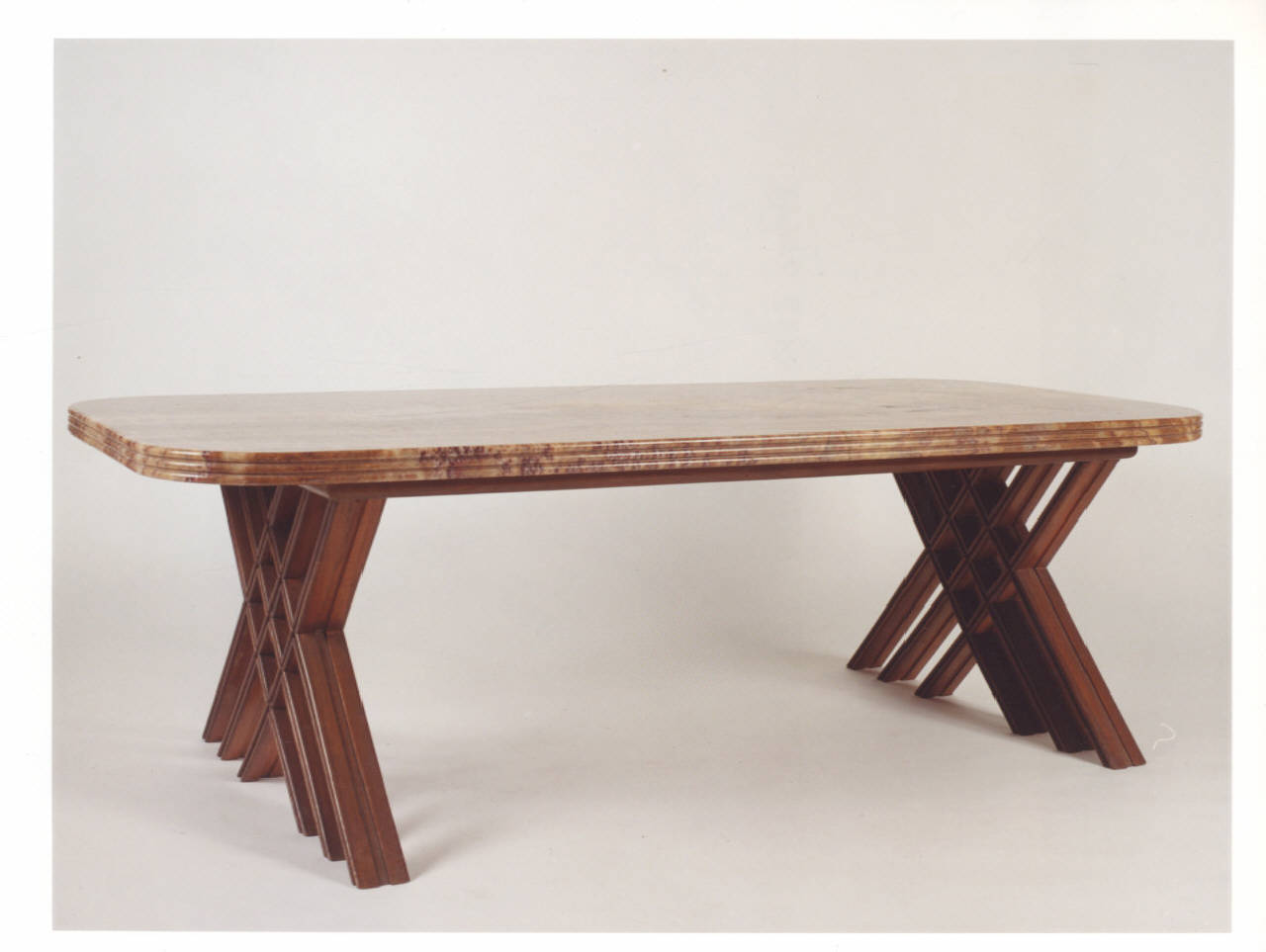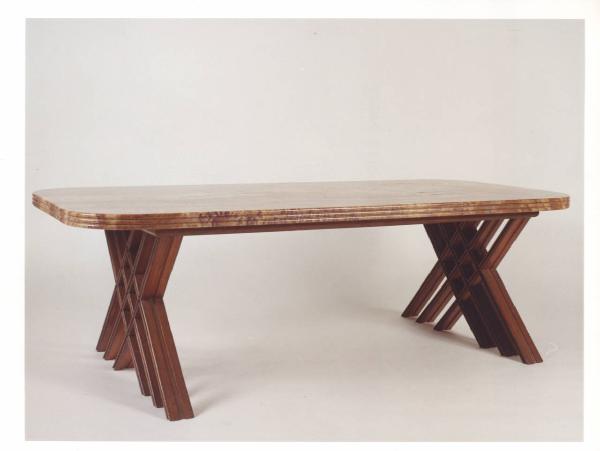Tavolino con piano in alabastro e sostegni in legno che formano, incrociandosi, dei rombi.