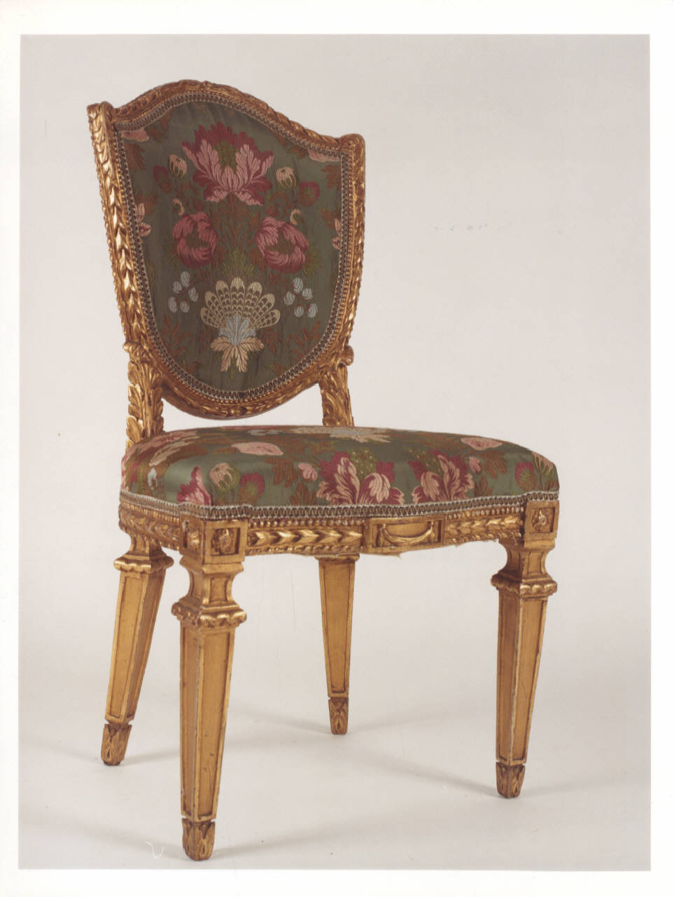 Serie di quindici sedie in legno dorato e intagliato, schienale e seduta in seta verde ricamata a punto pieno con motivi floreali nei toni del rosa e del porpora; sostegni a piramide, diritti nella parte anteriore, leggermente trasversali in quella posteriore, decorati superiormente da un cubo con piccole rosette e inferiormente da foglie d'acanto.