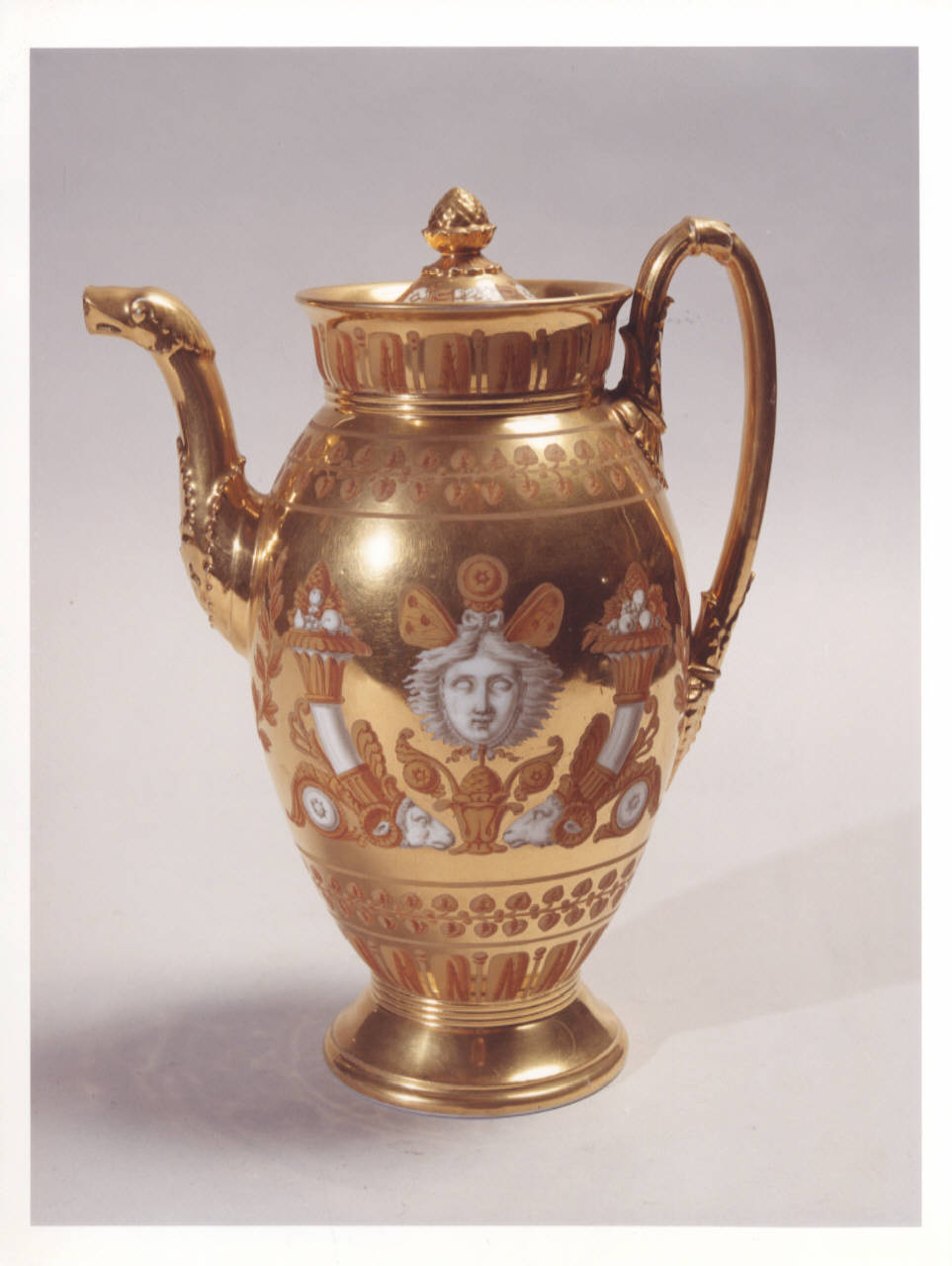 Caffettiera in porcellana dorata e dipinta con i caratteristici motivi decorativi dello stile Impero quali le maschere, le cornucopie con testa d'ariete, coperchio con piccolo pomolo, beccuccio a testa d'animale.