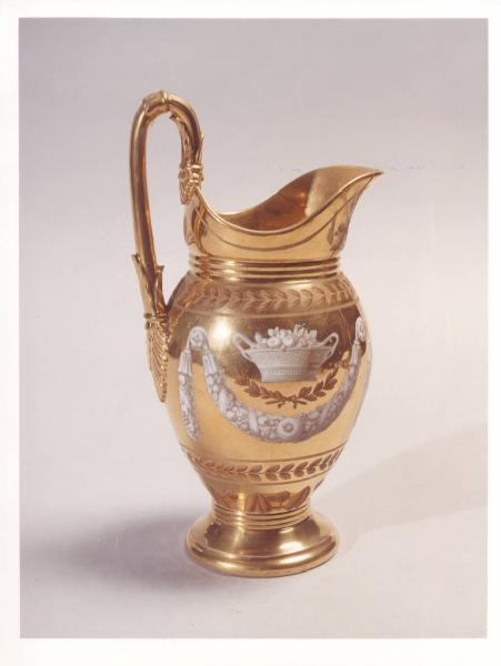 Lattiera in porcellana dorata e dipinta con i motivi caratteristici dello stile Impero, quali il festone di frutti e foglie sormontato da un cesto di frutta. Manico con terminazioni a foglia di palma, piede tondo.