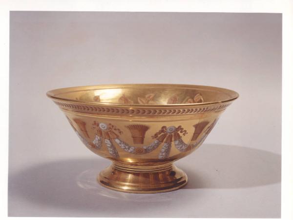Coppa in porcellana dorata e dipinta con i motivi caratteristici dello stile Impero, quali il festone di frutti e foglie. Piede rotondo.