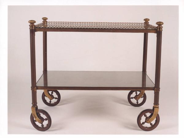 Carrello portavivande in legno a doppio ripiano; quello superiore racchiuso da una sottile cornice in metallo dorato con quattro pomoli agli angoli a forma di fiore.
