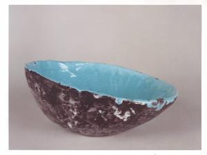Ciotola in ceramica invetriata con interno turchese e parte esterna più scura.