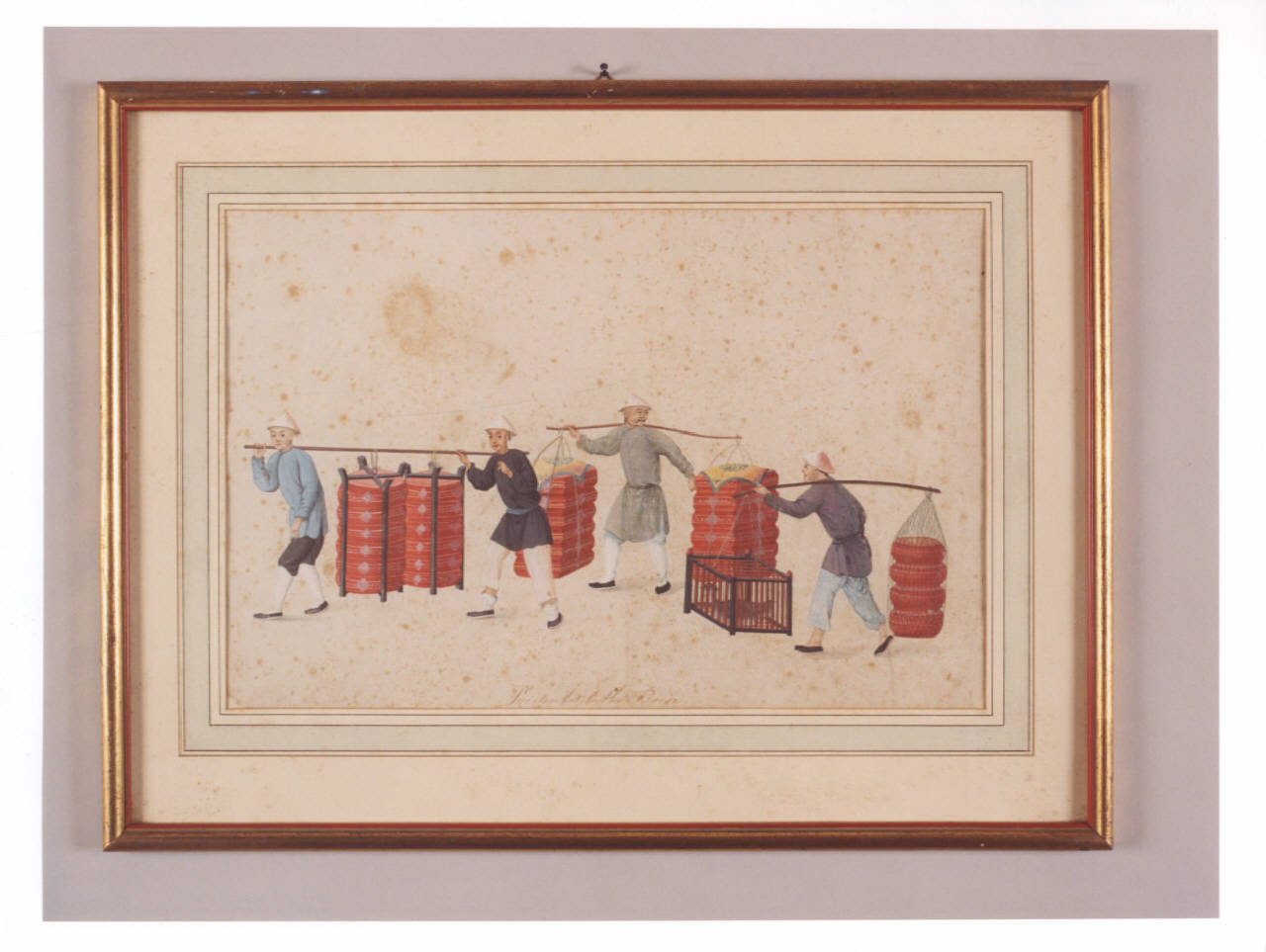 Tempera con raffigurazione di cinesi che trasportano dei cuscini e una gabbia con un'anatra.