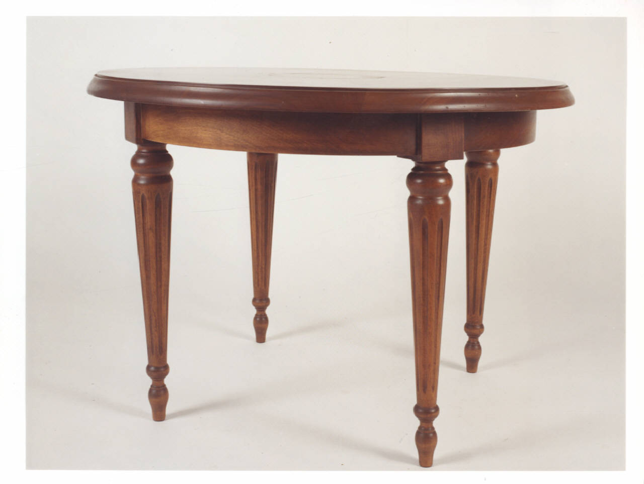 Tavolo tondo in mogano con gambe scanalate e rastremate verso il basso.