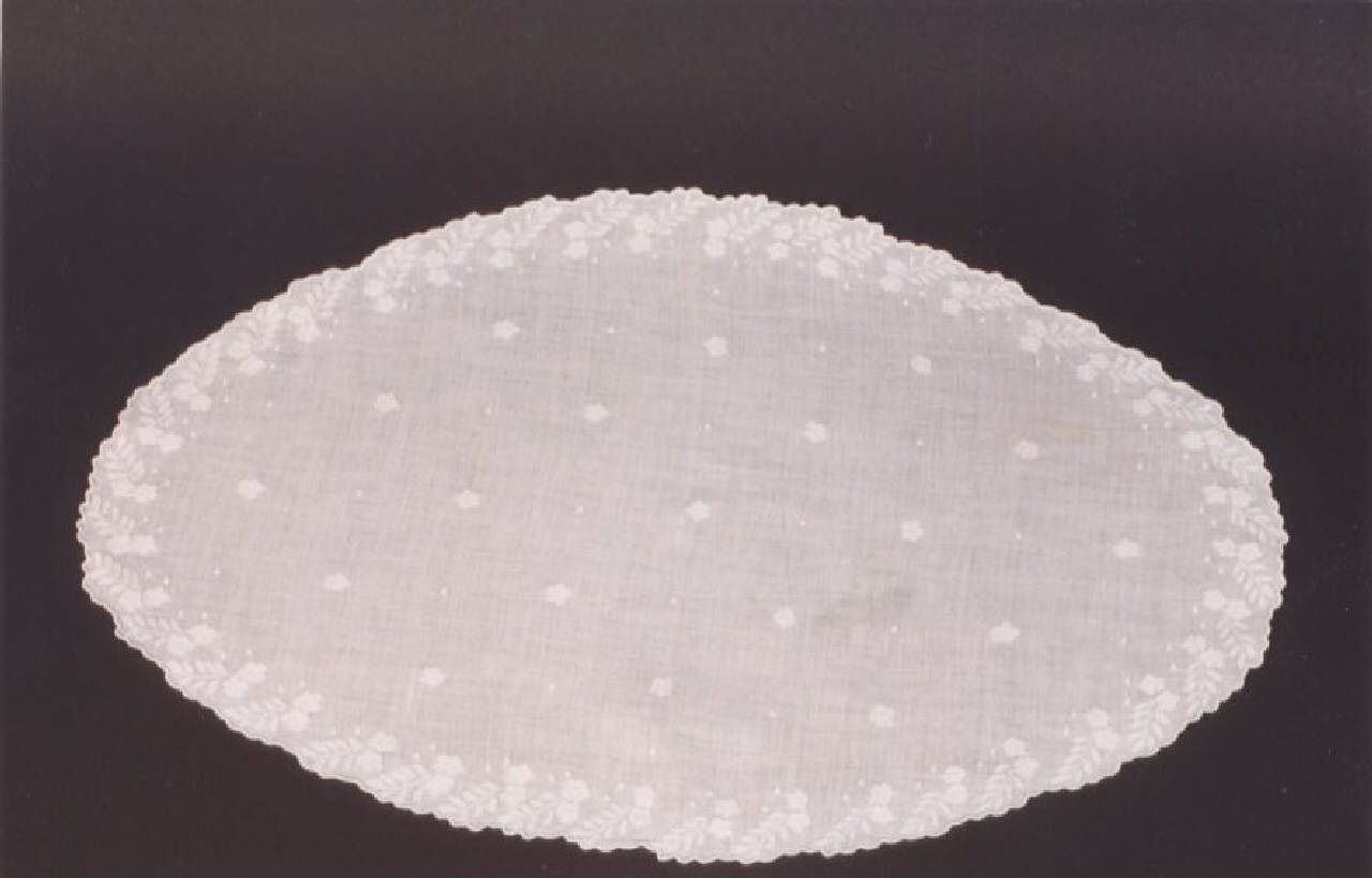 Centrino ovale in bisso di lino con decoro nel centro con fiorellini a cinque petali a punto pieno e bordura a festone con foglie e fiori; centrino di tulle con decoro con fiori e foglie a punto pieno come la bordura.