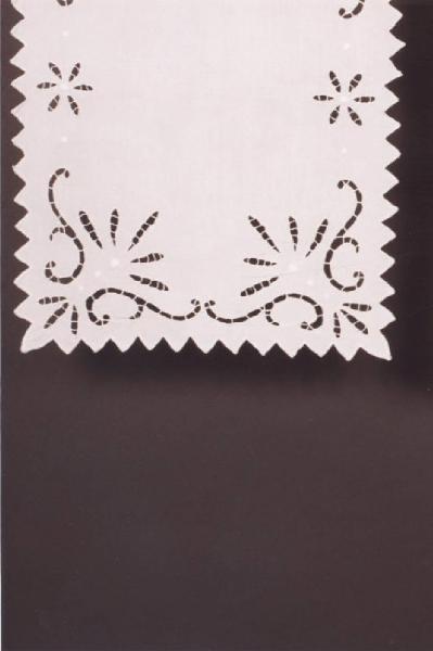 Tovaglietta in bisso di lino arancione con piccolo decoro a punto pieno e bordura a festone in bianco; tovaglietta in lino a punto intaglio e punto pieno con festone a punte.