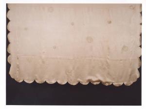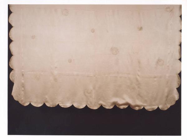 Copriletto in raso di seta con smerlo e ricamo con tondi a punto pieno.
