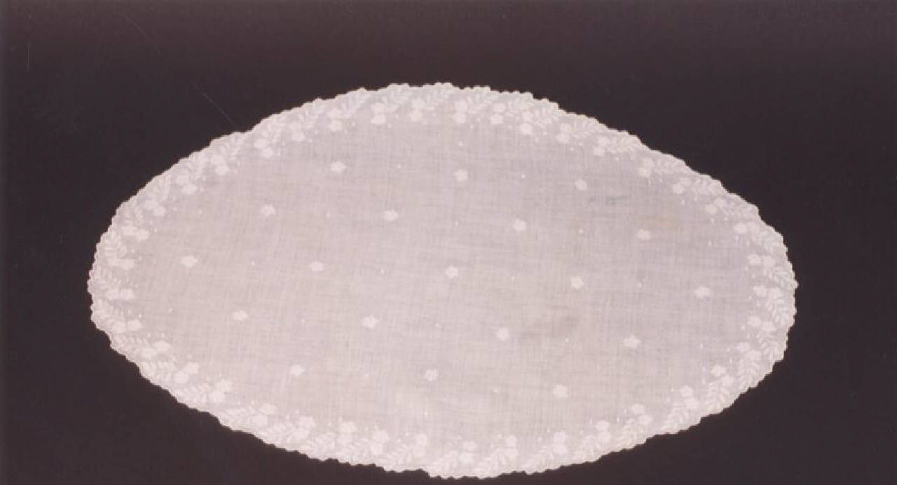 Centrino ovale in tulle con ricamo floreale; centrino in bisso di lino con ricami a piccoli fiori e bordura con fiori e foglie.