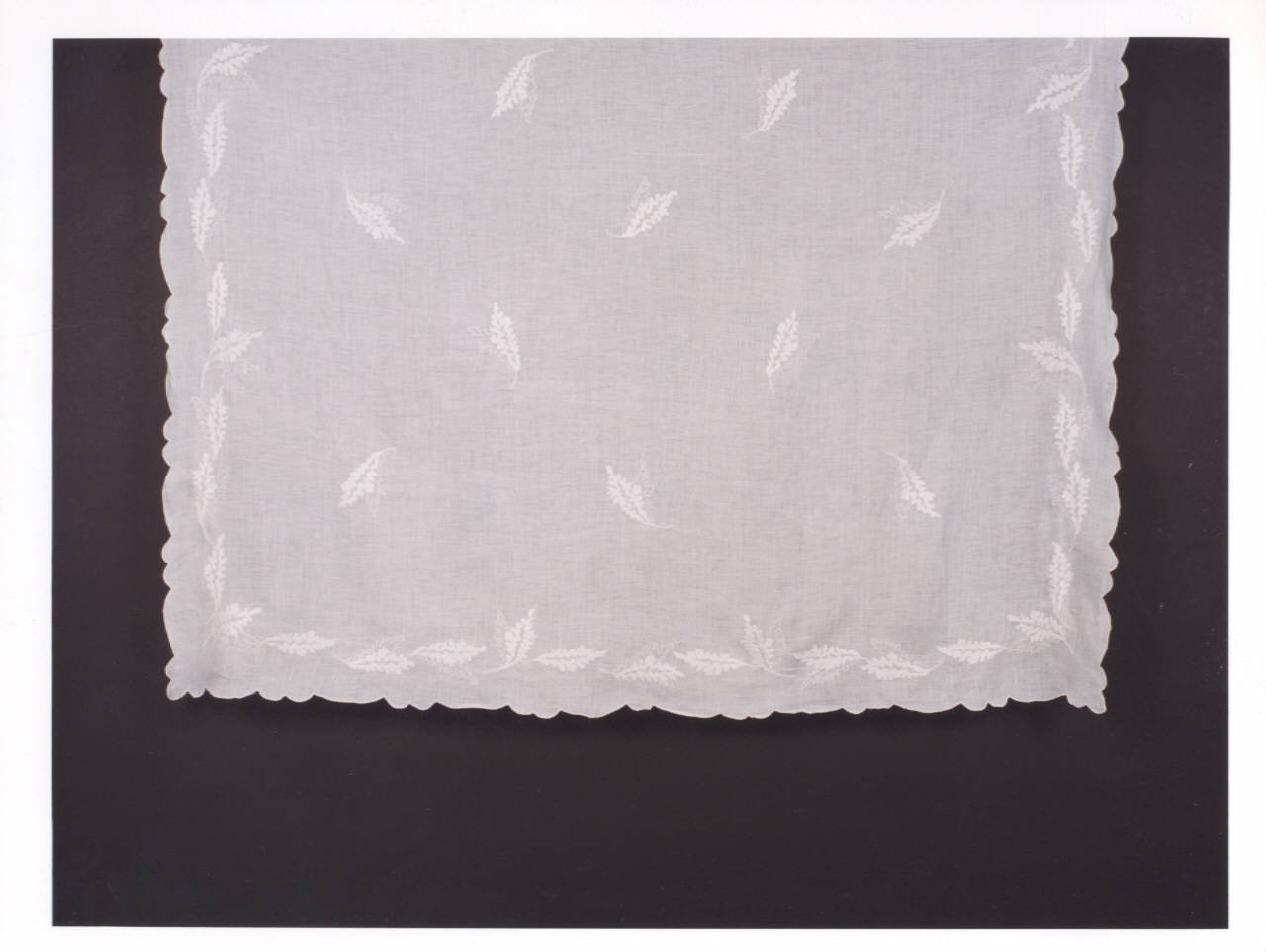 Tovaglia e relativi undici tovaglioli in bisso di lino con ricamo a foglie a punto pieno.