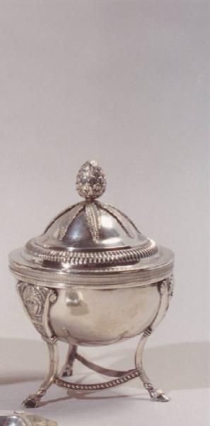 Zuccheriera a forma di tripode in stile Neoclassico con coperchio decorato da pomolo a pigna.