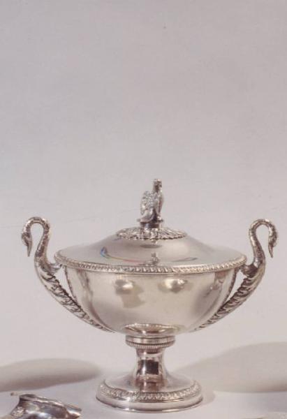 Zuccheriera con piede rotondo inciso a fogliette come sul coperchio con presa a forma di aquila; i manici sono formati da due cigni finemente incisi con corpo a foglia d'acanto.