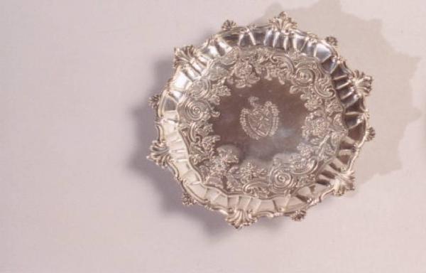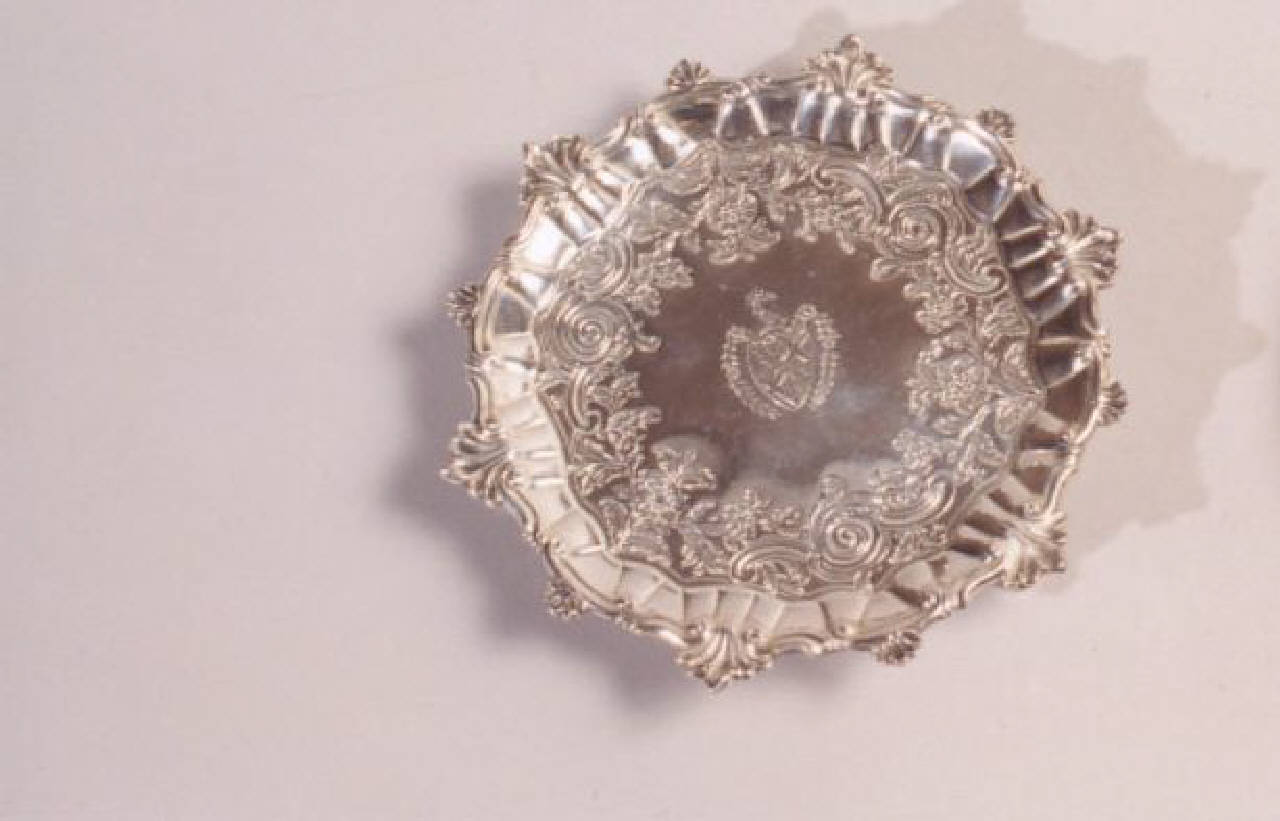 Vassoietto in metallo argentato e stampato con decoro floreale e al centro uno stemma.