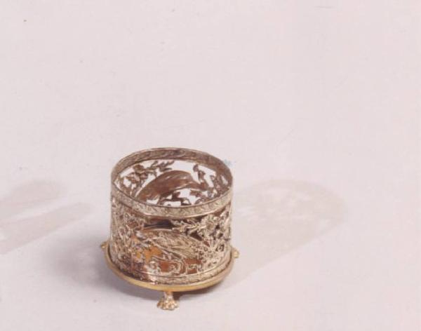 Portaoggetti in argento di forma circolare poggiante su piedini a zampa; decoro cesellato con pavoni.