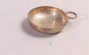 Tastevin: piccola ciotola in argento usata per la degustazione del vino. Decoro punzonato a grappolo d'uva e manico laterale a forma di serpente.