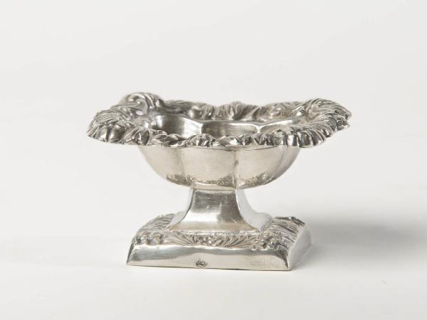 Saliera a base quadrata decorata con fiori; vaschetta per il sale con bordo lavorato a motivi floreali e fogliati.