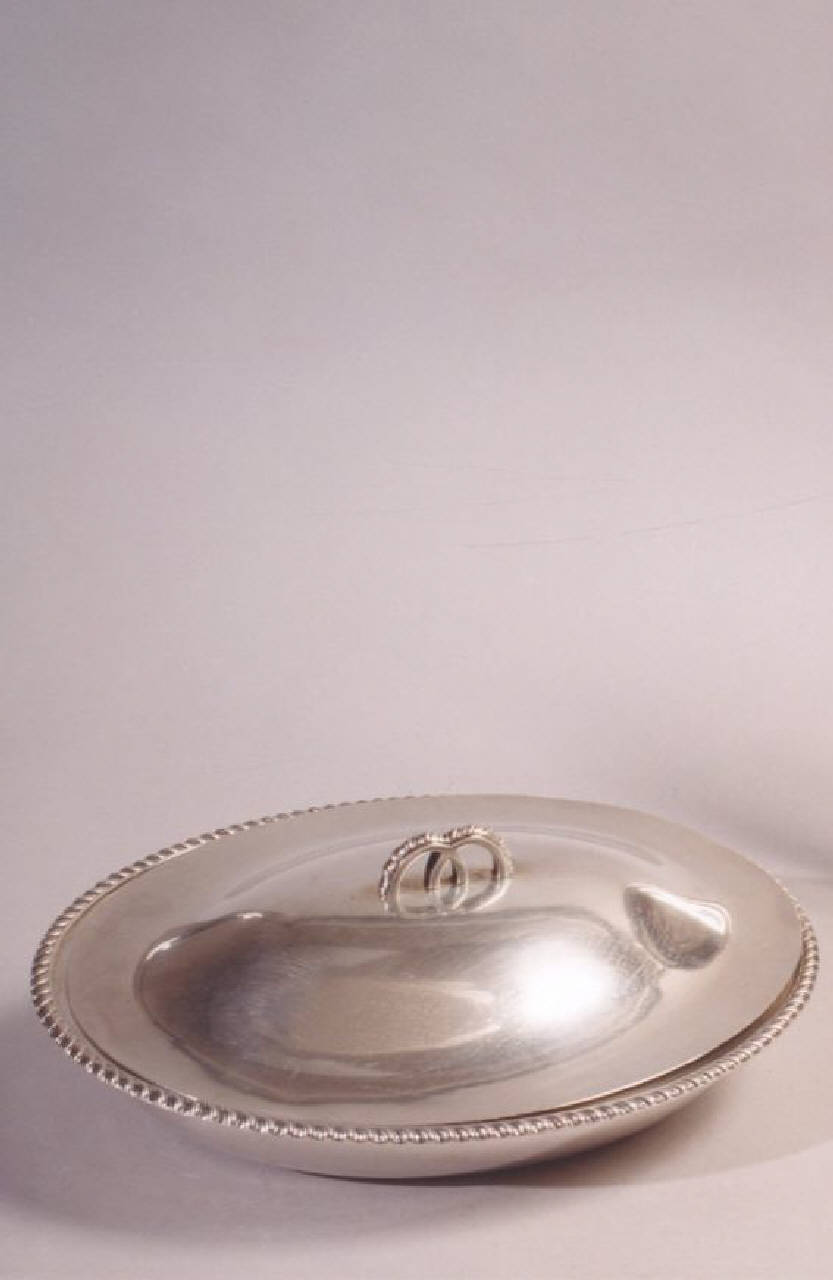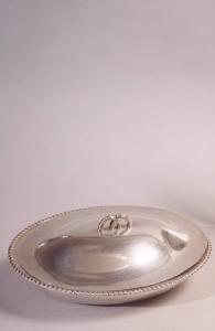Coppia di legumiere ovali con bordo bacellato, coperchio con impugnatura formata da due semicerchi.