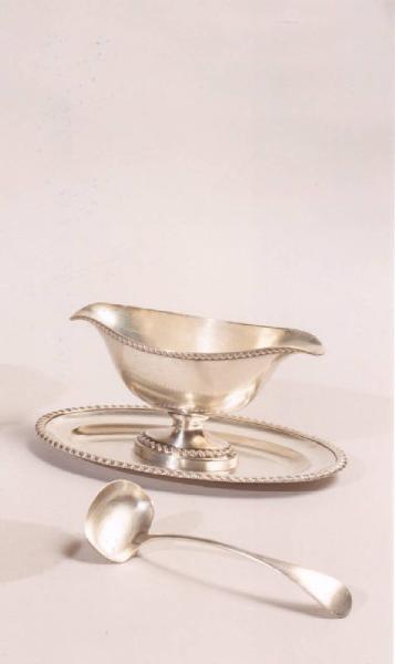 Coppia di salsiere con piatto, entrambe con profilatura bacellata. Sono corredate dal rispettivo cucchiaio.