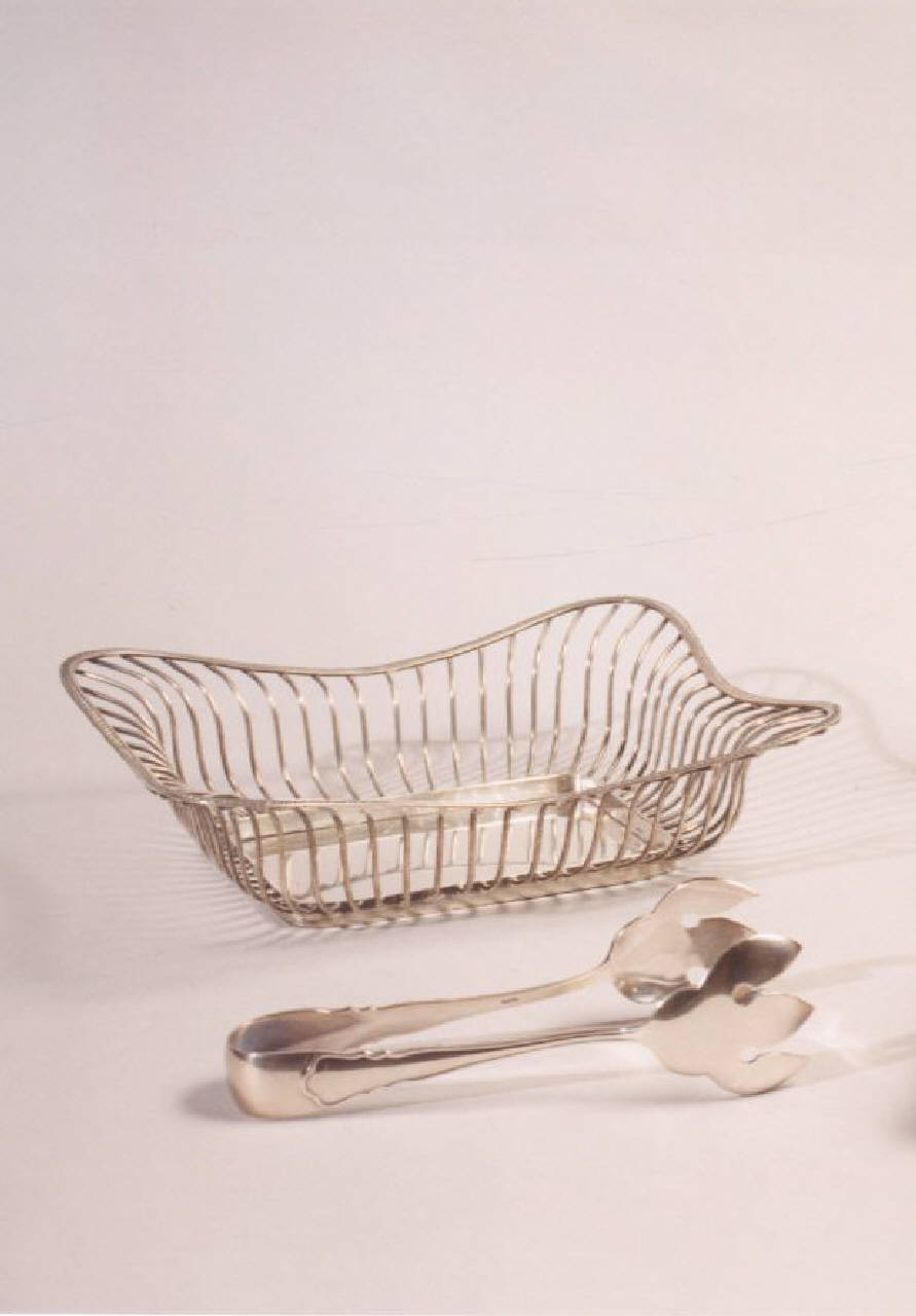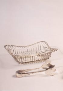 Cestino portapane con bordo sagomato. Due pinze sempre in argento.