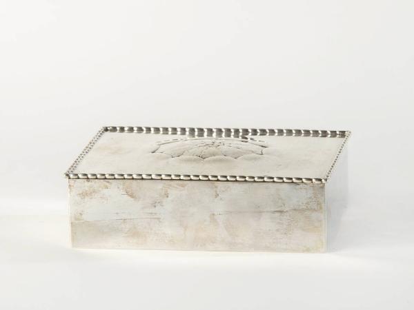 Scatola rettangolare con coperchio incernierato e decorato al centro con foglie in rilievo; bordo con piccole perline.